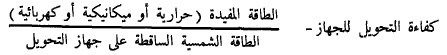 وينتج عن عملية تحويل الطاقة الشمسية فقدان بعض الطاقة . بحيث لا يمكن تحويل سوى جزء محدود من الطاقة الشمسية وتطلق عبارة كفاءة التحويل على نسبة الطاقة المفيدة إلى كمية الإشعاع الشمسي الساقطة على الجهاز ويمكن تمثيلها بالمعادلة.