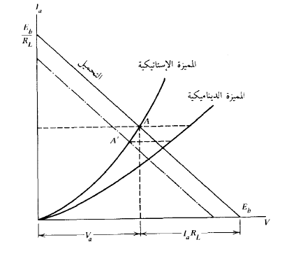 وبالطبع فإن هذه المعادلة لا تكفي لتحديد كل من المجهولين Ia, Va حيث أن جهد الأنود أصبح معتمداً على كل من جهد المنبع وتيار الأنود . ويمكن تحديد هذين المجهولين في آن واحد بإستخدام المعادلة (1) والمميزة الإستاتيكية للصمام. ولهذا الغرض يتم رسم ما يسمى يخط التحميل على المميزة الإستاتيكية. ويحدد هذا الخط بنقطتين. الأولى عندما يكون Ia = 0 , Va= Eb أي أنا نعتبر أن المقاومة الديناميكية للثنائي كبيرة للغاية بالنسبة لمقاومة التحميل. والنقطة الثانية عندما يكون Va = 0, Ia= Rb/RL أي أن المقاومة الديناميكية للثنائي صغيرة جداً بالنسبة لمقاومة التحميل . وبذلك يكون ميل هذا الخط عبارة عن -1RL وتحدد نقطة تقاطع خط التحميل مع المميزة الإستاتيكية قيمة التيار الأنودي مع المقاومة المعينة RL ، كما تحدد قيمة الجهد ا لواقع على الأنود والجهد الواقع على مقاومة التحميل , وعند تغيير جهد المنع يتم عمل خط تحميل جديد كالمبين بالخط المنقوط على الشكل 2 فيتقاطع مع المميزة في النقطة 'A . وهكذا تتكرر العملية ويتم في كل مره تحديد كل من جهد وتيار الأنود بواسطة نقطة التقاطع. بعد ذلك فرسم العلاقة بين التيار الأنودي وجهد المنبع فنحصل على منحنى المميزة الديناميكية.