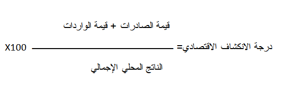مؤشر درجة الانكشاف الاقتصادي: وهو احد المؤشرات لقياس التبعية الاقتصادية, من خلال أَهمية الصادرات والاستيرادات من الناتج المحلي الاجمالي، وأَحياناً لا يعني ارتفاعه دليل على التبعية الاقتصادية وإِنما يشير إِلى إمكانية تعرض اقتصاد الدولة إِلى الاختلال نتيجة لظروف تحيط بالتجارة الخارجية, ويتم احتساب مؤشر الانكشاف الاقتصادي من خلال المعادلة الأَتية: