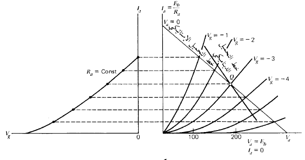 عند إستخدام المكبر في الدارات العملية يتم ربط مخرج المكبر في العديد من الدارات بمدخل المرحلة التالية (أو الجهاز التالي) بواسطة سعة ربط Cg لعزل جهد الأنود المستمر من الوصول إلى المرحلة التالية وتمثل Rg مقاومة دخل المرحلة التالية أي المقاومة التي يحمل عليها جهد الخرج . عندما كانت دارة الخرج على خط التحميل الإستاتيكي مفتوحة (أي أن ∞ : Rg ) ولكن إذا كانت ∞ > Rg فإنه يختلف خط التحميل بإختلاف قيمة المقاومة Rg . فإذا فرضنا أن تردد النبضات المكبرة كاف بحيث تكون ممانعة المكثف Cg صغيرة جداً بالنسبة لقيمة المقاومة Rg نجد أن كل R= RL×Rg/RL+Rg من المقاومة Rg ، RL المتصلتين على التوازي تشكل التحميل الحقيتي لدارة الأنود أي أن مقاومة التحميل الفعلية هي وهذه المقاومة أقل من كل من RL ، Rg بذلك تكون أقصى قيمة للتيار المار خلال الصمام أعلى من القيمة الأولى أي عند (Ia = Ea/R)وأقصى جهد للأنود أقل من Eb . وبتوصيل هاتين النقطتين الجديدتين نحصل على خط التحميل الديناميكي أو خط التحميل للتيار المتردد كالمبين في شكل (1) .