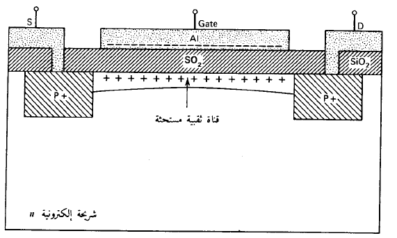 ويبين شكل (1) ترانزستور ذا بوابة معزولة بقناة ثقبية التوصيل. ويتكون هذا الترانزستور من شريحة من مادة إلكترونية التوصيل نسبة تركيز الشوائب فيها قليلة. وتوجد في هذه الشريحة منطقتان ثقبيتا التوصيل +P نسبة تركيز الشوائب فيه عالية جدا. وتعمل إحدى هاتين المنطقتين كمنبع والأخرى كمصب. وتفصل بين المنطقتين مسافة تبلغ حوالي 10 — 20 ميكرومتر. وتغطى المادة شبه الموصلة بطبقة رفيعة عازلة من ثاني أكسيد السليكون (CiO2) يبلغ سمكها حوالي 1000 — 2000 إنجستروم. وتعمل في المادة العازلة فتحتان لعمل التوصيلات المعدنية لكل من المنبع والمصب. ثم تغطى الطبقة الأكسيدية بطبقة معدنية تعمل كبوابة. وتبلغ المساحة السطحية لهذا الزاتزستور حوالي 2 مم2 أو أقل. وهكذا يلاحظ أن البوابة المعدنية معزولة عن القناة بطبقة أكسيدية عازلة ومكونة مع القناة مكثف ذي لوحين متوازيين .