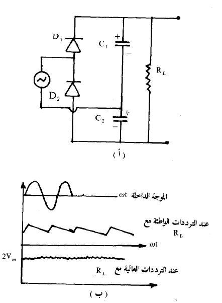 لفهم عمل الد ائرة في الشكل (1أ)، نفرض ان الجزء المسلط من الموجة الد اخلة. هو النصف الموجب. عندئذ سيقوم الثنائي D1 فقط ، بامرار التيار ليشحن المتسعة C1 بالشحنة المبينة عيها في الشكل (1أ). اما عند تسليط النصف السالب من موجة الادخال فان الثنائي D2 ، فقط سوف يسمح بمرور التيار ليشحن المتسعة C2 بالشحنة المبينة عليها. وبهذا فان مجموع الجهد الذي يظهرعلىك لمنو وسيكون مساويا 2Vm انظرالشكل (1ب).
