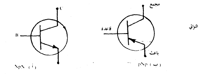 بمتلك الباعث دون المجمع رأس سهم. ولاتجاه السهم هذا اهمية خاصة حيث انه يشير الى نفس اتجاه تيار الباعث المتعارف عليه وبالنالي فان الفرق ين الرمزين هو في اتجاه السهم . او بعبارة اخرى ان تيار الباعث في النوع NPN يخرج من الباعث بينما يجري تيار القاعدة وتيار المجمع الى خارج الترانزستور اما في حالة الترانزستور من نوع PNP فالتيار الباعث يجري الى داخل الترانزستور في حين يخرج من الترانزستور كل من تياري القاعدة والمجمع – انظر الشكل (1ب)