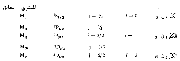 إن مختلف السويات الطاقية LIII , LII , LI , K يمكن أن تفسر كأنها شاردة لذرة فقدت واحد من الكتروناتها . يمكننا أن نميز كل من هذه المستويات كما في الشكل (1).
