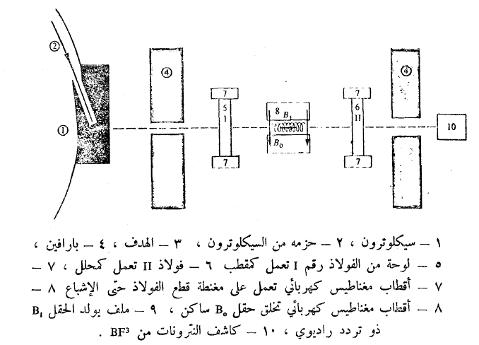 العزم المغناطيسي μo سيتواجد بدون صعوبة من نبضة الطنيين ωo بالحقيقة لقد صمم الجهاز بشكل يحقق في نفس الحقل Bo طنين مغناطيسي نووي للبروتونات عند نبضات ω'o ، يسمح قياس ωo و ω'o بتحديد النسبة