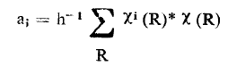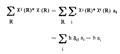 ai هي معاملات لخواص التمثيل غير القابلة للإرجاع الذي نبحث عنه. ويتم الحصول عليها بسهولة باستخدام علاقة التعامد للخواص: لنضرب طرفي العلاقة (1) بحد *(R)χi وبالجمع على كل عناصر الزمرة ككل: