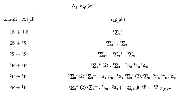 - إذا كانت الذرتان في حالات مختلفة. فمن آجل كل حالة جزئية نحصل عليها بإستخدام نتائج الفقرة السابقة وسيكون لدينا حالتان واحدة من نوع g والأخرى من نوع u. مثال: الذرة الأولى في الحالة 1Sg والثانية في الحالة 1pu نحصل على الحالات الجزئية +∑1 و 1π لكن بالحقيقة لدينا حالتين +∑1 وحالتين 1π والسبب كون الحالات الجزئية آتية من (1Pu + 1Sg او 1Pu + 1Sg) وعليه تكون الحالات الجزئية هي أربع