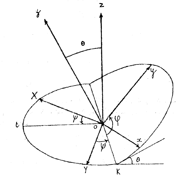 - في المستوي XOY نرمر ب ψ الزاوية OY، OK وهي مساوية للزاوية (Ot ,OX) والمعرفة 2Kπ.
