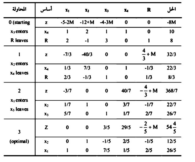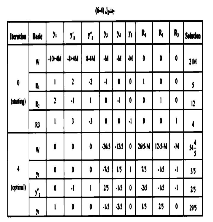 وبحل المسألتين كل على حدة بواسطة طريقة السمبلكس تلاحظ الحل في الجداول (6.3) و (6.4).