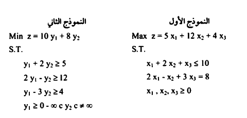 ويمكن شرح العلاقة بين النموذج الأول (primal pnoblem) والنموذج الثاني (Dual problem) بواسطة العلاقة الرياضية التالية: