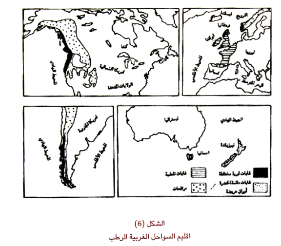 يتمثل اقليم السواحل الغربية في مناطق الغابات على السواحل الرطبة وشبه الرطبة غربي القارات. ويظهر هذا الاقليم على الشواطئ الغربية من الولايات المتحدة وكندا فيما بين ولاية أوريجون وكولومبيا البريطانية (شكل6)، وفي الجزر البريطانية، وغربي أوروبا، وفكتوريا وتسمانيا ونيوزيلندا. ويمتاز بمناخ لطيف في الشتاء بالمقارنة مع الموقع بين درجتي عرض 35 و 60 ويحدث أن تهطل الأمطار كل شهر تقريباً، ولذلك يرتفع المحتوى المائي للتربة طوال السنة، ونادراً ما يحدث عجز مائي في فصل الصيف.