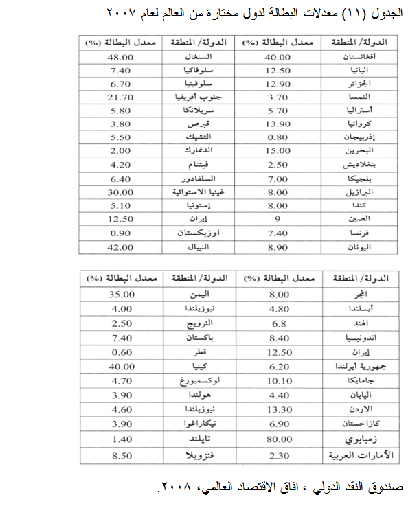 أما في البلدان المتقدمة فقد بلغ متوسط معدل البطالة %8.6 في عام 2011. وترتفع معدلات البطالة بين الشباب (15-24 سنة) لتكون أعلى من الأفواج الأخرى من قوة العمل في معظم دول العالم(4). ويظهر التباين واضحاً بين دول العالم فتصل معدلات البطالة في بعضها إلى 80%، في حين تنخفض في دول أخرى إلى أقل من 1%، (الجدول 11). وعلى الرغم من أن هذه المعدلات لا تشير بشكل مطلق إلى البطالة الحقيقية، لأن تلك البلدان تختلف في أنظمتها الاقتصادية واتجاهاتها السياسية، إلا أن في انخفاض تلك المعدلات إشارة إلى حيوية الاقتصاد وتوفر الموارد المالية ورؤوس الأموال والاستثمارات المالية. وعند شيوع ممارسات التحول إلى اقتصاد السوق وتحول القطاع العام إلى القطاع الخاص، سرت موجة من تسريح العاملين، وتوقفت أو ضعفت حركة التوظيف في القطاع العام، مما خلق بطالة كبيرة في صفوف العاملين في الأنظمة المتحولة.