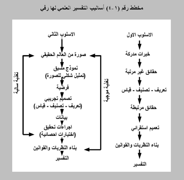 4- أن الفرضيات التي يتم إثباتها تصبح قانونا ربما يمكن تعميمه على مناطق أخرى تحمل نفس خصائص منطقة الدراسة التي أثبتت فيها تلك الفرضيات ,وربما يسري هذا التعميم لفترة معينة ولا يكن بشكل مفتوح في كل الأوقات.(2) وقد وضع هارفي في عام 1969 أسلوبين للتفسير العلمي وكما في المخطط رقم (1-4).(3)