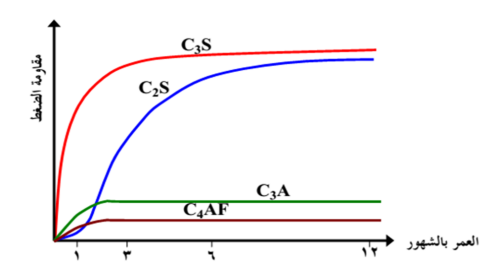 الكالسيوم . يبين الشكل التالي تاثير المركبات الاربعه الاساسيه على مقاومة الضغط بالنسبه للخرسانه حيث يتضح انه يفضل استخدام الاسمنت المحتوى على نسبه عاليه من ثالث سيليكات الكالسيوم في العناصر الانشائيه المطلوب لها مقاومه عاليه .