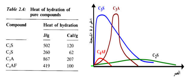 ويبين الشكل التالي كمية الحرارة المنبعثه نتيجة اماهة المركبات الاساسيه للاسمنت ولحظات ظهورها