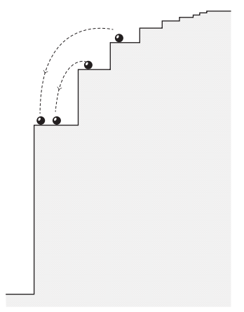شكل 4-1: ٍ يمكن مقارنة مستويات الطاقة في ذرة بسيطة مثل الهيدروجين بمجموعة من درجات السلم ذات أعماق مختلفة. تمثل الكرة الموضوعة على الدرجات المختلفة إلكترونًا في مستويات الطاقة المختلفة في الذرة. وتقابل الحركة من درجة أعلى إلى درجة أدنى انطلاق كمية محددة من الطاقة، وهي المسؤولة في ذرة الهيدروجين عن خطوط سلسلة بالمر في الطيف. ولا توجد خطوط بينية؛ لأنه ليس ثمة درجات بينية لكي «يستقر» عليها الإلكترون.