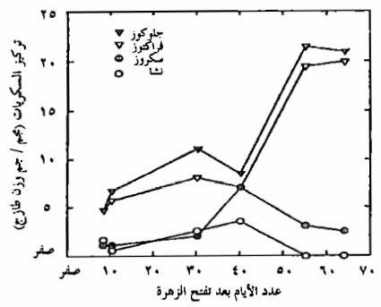 شكل يوضح التغيرات في محتوى ثمار الفلفل من أهم السكريات خلال مختلف مراحل نموها حتى اكتمال النضج.