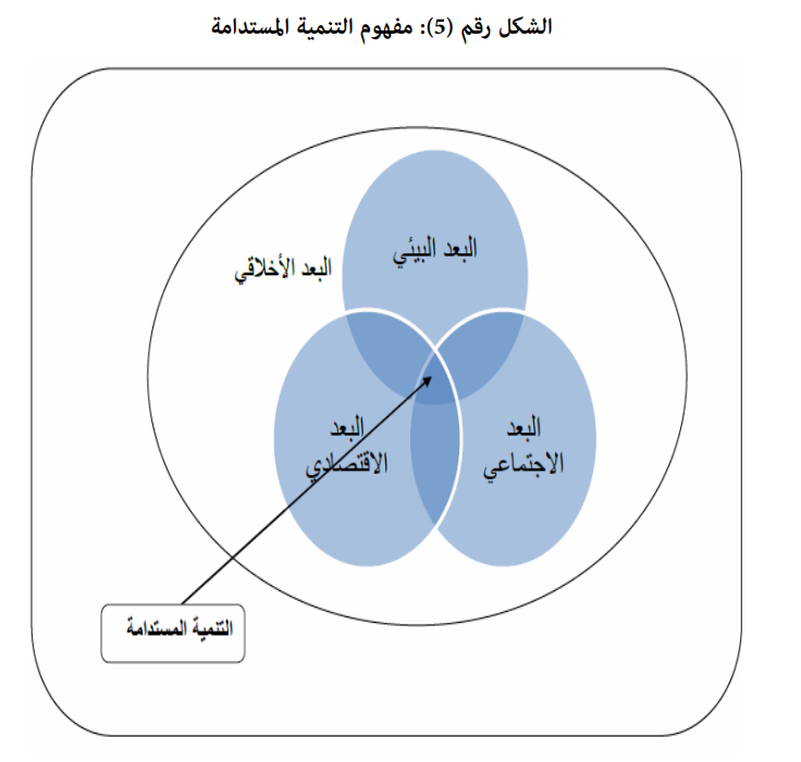من خلال الشكل نوضح أن التنمية المستدامة تتحقق في ظل توفر البعد الاقتصادي والذي يهدف إلى تعظيم المنفعة والرفاه والبعد الاجتماعي الذي يضمن الحق في التعليم والصحة والعمل.. الخ لمفردات المجتمع مع توفر البعد البيئي الذي هدفه الرئيسي المحافظة على البيئة وأنظمتها، وكل هذا يحدث في ظل توفر البعد الأخلاقي والذي بنظرنا يضمن توفر العدالة ورشاد والاستمرارية وبهذا تتحقق التنمية المستدامة.