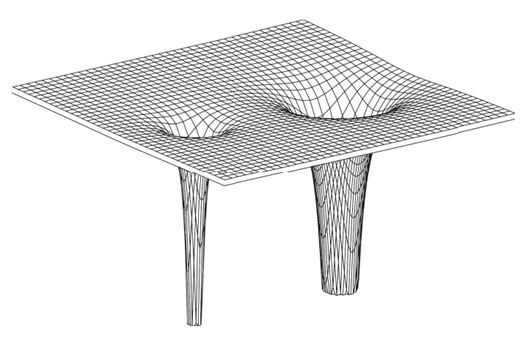 شكل 1-2: التشوه، أي الانحناء في نسيج الزمكان بسبب وجود الكتل.