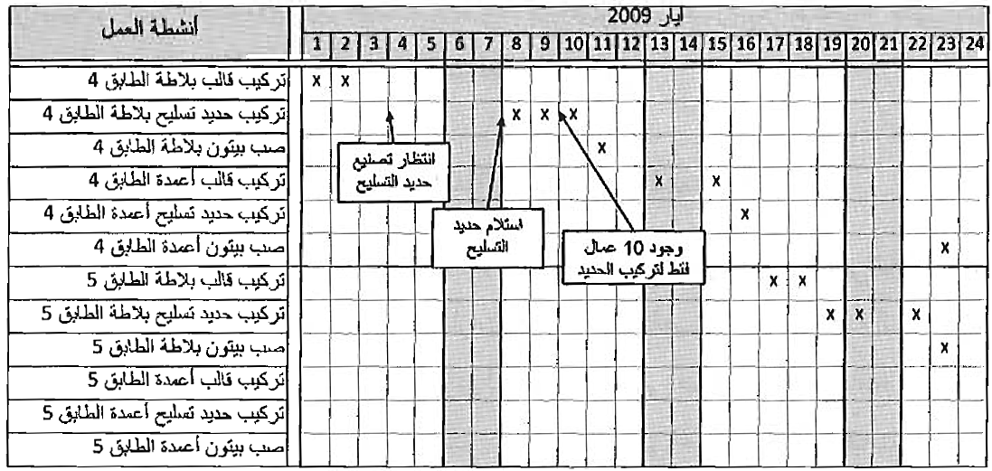 يظهر الشكل (1) مخطط فعلي باستخدام برنامج Excel ، لتفصيل المعلومات الفعلية لعمل البيتـون المسلح بين تاريخ 1 أيار 2009 وتاريخ 24 أيار 2009. يصور الجدول الظاهر في الشكل (1) تاريخ البداية المتأخر وتقدم العمل بشكل أبطأ من المتوقع لتنفيذ حديد تسليح البلاطة في الطابق الرابع. تشير الخلايا المظللة إلى أيام العطل بالتوافق مع الجدولة الزمنية الخاصة بالمقاول. خلال قراءة المعلومات الفعلية، يلاحظ المحلل أن السجل اليومي لمالك المشروع في 3 أيار 2009 ، يذكر أنه لا يمكن أن يبـدأ تنفيذ حديد تسليح بلاطة الطابق الرابع لأن المقاول ينتظر تصنيع حديد التسليح. كما أن السجلات اليومية لمالك المشروع قـد ذكرت أيضاً أنه في 7 أيار 2009، استلم المقاول حديد التسليح ، وبدأ تركيبه في الطابق الرابع بتاريخ 8 أيار 2009. بإدخال هذا المستوى من التفصيل في المخطط الفعلي يعطي للمحلل فهما أوضـح عنـد حـدوث التأخيرات على الأنشطة ويساعده على تحديد أسباب التأخيرات على المسار الحرج للمشروع.