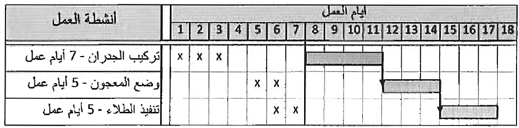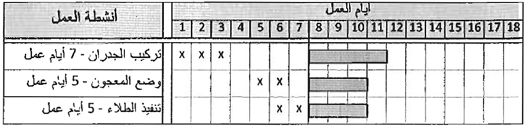 بالاعتماد على الشكل (4)، واستخدام خيار اتباع العلاقات المنطقية التي أبقت على تسلسل العلاقات (نهاية - لبداية) بين الأنشطة ، فإنه حتى لو تقدم العمل في أنشطة المعجون وتنفيذ الطلاء مدة 4 أيـام خـارج التسلسل المنطقي التخطيطي. فقد بقي المقاول يخطط للانتهاء في اليـوم 17، وبقي يخطط لتقدم العمل المتبقي من تركيب الجدران ووضع المعجون وتنفيذ الطلاء لاء باستخدام العلاقات المنطقية (نهاية - لبداية).
