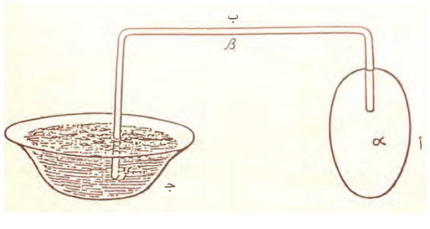 يوضح الشكل التجربة التي قام بها فيلون ليُثبت تمدُّد الهواء بالحرارة وتقلصه بالبرودة حيث (أ البيضة، ب: السحارة، جـ: وعاء الماء). (مصدر الشكل: شوقي، جلال، أصول الحيل الهندسية في الترجمات العربية، ص 49).
