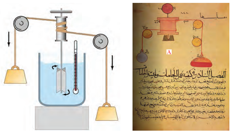 (على اليمين) صورة من مخطوطة «الجامع بين العلم والعمل النافع في علم الحيل» (نسخة طوبقابي سراي أحمد الثالث إستانبول، رقم 3472.) لابن الرزاز الجزري، وهي توضّح كيف استفاد الجزري من هذه التركيبة لتوليد حركة دائرية من حركة انسحابية، (مصدر الصورة نسخة طوبقابي سراي أحمد الثالث، إستانبول، رقم 3472. ص 138.) وهي تركيبة شديدة الشبه كثيرًا بتجربة جول (على اليسار) (مصدر الصورة: الموقع www.geo.arizoa.edu) التي أنجزها خلال الأربعينيات من القرن التاسع عشر الميلادي، عندما قاس كمية الطاقة الميكانيكية اللازمة لرفع درجة حرارة كمية معيَّنة من الماء بدرجات حرارة معينة. وسُمِّيت العلاقة بين الطاقة الميكانيكية والطاقة الحرارية المكافئ الميكانيكي للحرارة. إلا أن الجزري لا يذكر لنا شيئًا عن عملية الاحتكاك في الموقع (A) وكيفية تحوّل الطاقة الميكانيكية إلى حرارة بين المحول والمسند المرتكز عليه. نعقد مقارنةً بين مخططي الآليتين حتى نبيِّن كيف تتشابه طريقة التفكير العلمية بين العلماء مهما كانت الفجوة الزمنية كبيرة؛ فالمنطق العلمي الصحيح في المقدمات سيؤدي إلى نتائج صحيحة بالضرورة.