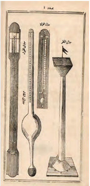 رسم يعود تاريخه إلى عام 1884م، من كتاب «منتخبات الصناعة في فن الزراعة»، يوضّح أشكال الموازين الحرارية التي يستخدمها المزارعون آنذاك، وذلك بهدف التأسيس لقيام زراعة تعتمد على العلم الدقيق، ومادَّته معظمها مأخوذة من الكتب الأوروبية المعاصرة في القرن 19م. (مصدر الصورة: منتخبات الصناعة في فن الزراعة، بشارة بن سلوان نحول اللبناني، المطبعة الأهلية، بيروت، 1884م، ص 137. النسخة الأصلية من هذا الكتاب محفوظة في مكتبة قطر الوطنية، رقم «102619».)