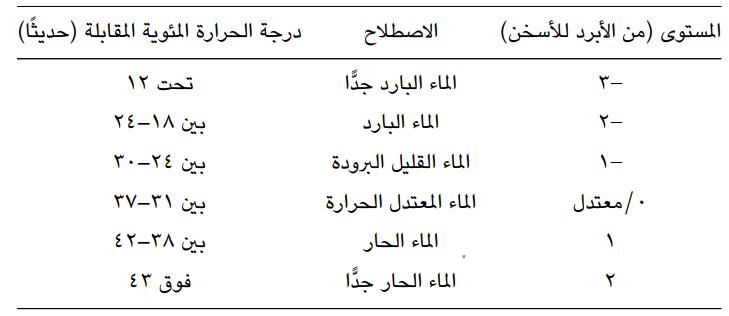 وقد استخدم العلماء العرب والمسلمون في بداية تعاملهم مع علم الحرارة – مثلهم في ذلك مثل غيرهم من الأمم السابقة – المنهج الذاتي في القياس؛ أي حاسة اللمس، وذلك لتقرير فيما إذا كان الجسم حارًا أم باردًا. طبعًا ليس الأمر واحدًا بالنسبة لشخصين يتحسسان الوعاء نفسه؛ أي إن هذه الطريقة يعتريها الكثير من الأخطاء، ولا يتم الاتفاق على قيمة محددة لدرجة الحرارة بين جميع من يمد يده. وقد وضع العرب تقسيمات الحرارة الخاصة بالماء الملموس (الحالة السائلة)، نوردها فيما يأتي مع المقابل الرقمي الحديث للاصطلاحات المستخدمة في وصفها: 7