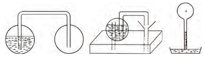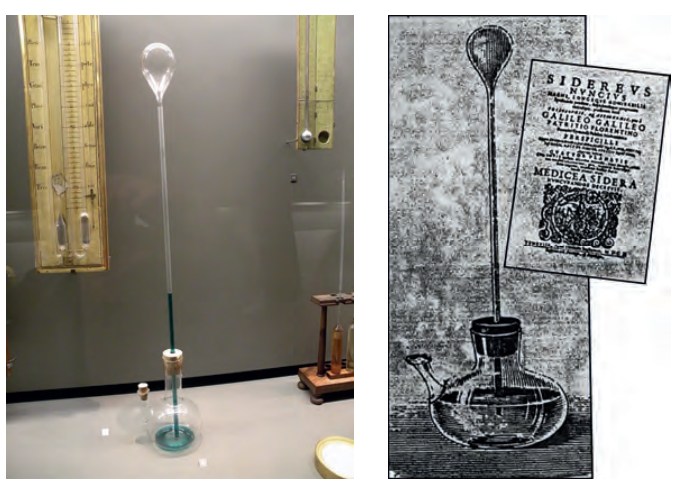 (إلى اليمين) (مصدر الصورة: اختراعات جاليليو، مجلة الصفر، المجلد، العدد 17، المركز العربي للدراسات الدولية، نيقوسيا، 1987م، ص 43. مكشاف جاليليو الحراري، وهو أداة تُسجِّل التغيرات الحرارية لدى ملامستها لأي جسم ساخن. (إلى اليسار) (مصدر الصورة: //:https en.wikipedia.org/wiki/Thermoscope) نسخة مُصَمَّمة حديثًا عن مكشاف جاليليو وهي موجودة في متحف أدوات الفن والقياس في باريس.