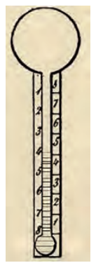 مقياس الحرارة الهوائي لميرسن، وهنا نلاحظ بداية وضع تدريجين متعاكسين؛ أحدهما من 1 إلى 8، والآخر من 8 إلى 1؛ حيث يمكن استخدامه بكلتا الحالتين (مصدر الصورة:Frisinger, H. Howard, A History of Meteorology: to 1800, American Meteorology Society, New York, 1977. p. 50).