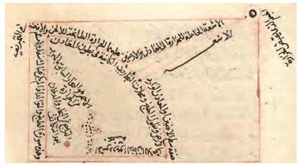 رسم تخطيطي وضَعه الطغرائي في كتابه (مفاتيح الرحمة وأسرار الحكمة) يُبين فيه كيف تأتي الأشعة الحاملة للحرارة من جرم سماوي، لم يُحدد أنه الشمس، حيث تدخُل عبر سطح الأرض، فتتشكّل أبخرة وأدخنة تُسهم في تشكل المعادن والفلزات في باطن الأرض؛ أي إن مصدر حرارة تشكل المعادن خارج الأرض وليس باطنها.( مصدر الشكل: مخطوطة مفاتيح الرحمة وأسرار الحكمة للطغرائي، ج 1، ص 5و.)