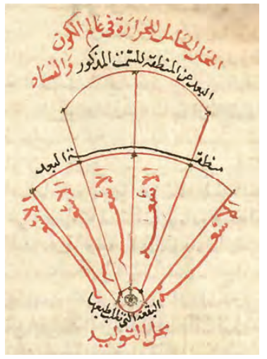 شكل توضيحي آخر يُبين فيه الطغرائي آلية دخول الأشعة الحرارية إلى باطن الأرض وكيفية تركزها على بقعة معيَّنة، ويُلاحظ أن الأشعة المسامتة؛ أي التي تقع بشكل عمودي فوق هذه البقعة تؤثر أكثر من غيرها الجانبية، لكن لا نعرف كيف فات الطغرائي أن «منطقة البعد على الشكل أو سطح التماس بين الأشعة وباطن الأرض محدب الشكل، وهذا من شأنه أن يفرق الأشعة – حسب قوانين البصريات – لا أن يجمعها في محل التوليد». (مصدر الشكل: مخطوطة مفاتيح الرحمة وأسرار الحكمة، للطغرائي، ج 1، ص 94و.)