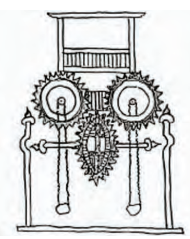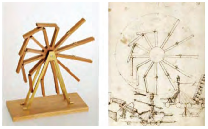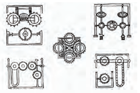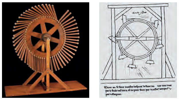 (إلى اليمين) دولاب فيلار دو هنكور الذي يدور بشكل أبدي والمأخوذ عن نص عربي مجهول المؤلّف كما ورَدَ في رسوماته. مصدر الصورة: Bowie, Theodore, The Medieval Sketchbook of Villard de Honnecourt, Dover Publications, Inc. Mineola-New York, 2006, p. 17