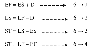 3. تحديد أوقات البداية المتأخرة LS والنهاية المتأخرة LF لأنشطة المشروع، بالرجوع إلى الشكل - والمعادلات الموجودة أسفل الرسمة نستطيع أن نرسم الأوقات المذكورة لأنشطة المشروع كما تظهر في الشكل 6-8