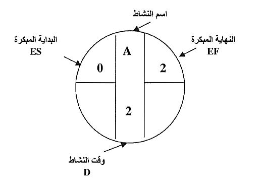 2. تحديد النهاية المبكرة (Earliest Finish (EF لكل نشاط وهذا يعني أبكر وقت ممكن أن ينتهي به ذلك النشاط وتكون النهاية المبكرة EF لأي نشاط تساوي البداية المبكرة لذلك النشاط ES مضافاً لها الزمن اللازم لإنجاز ذلك النشاط .