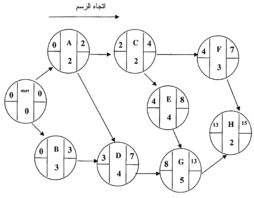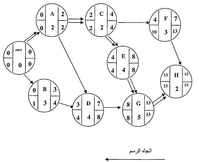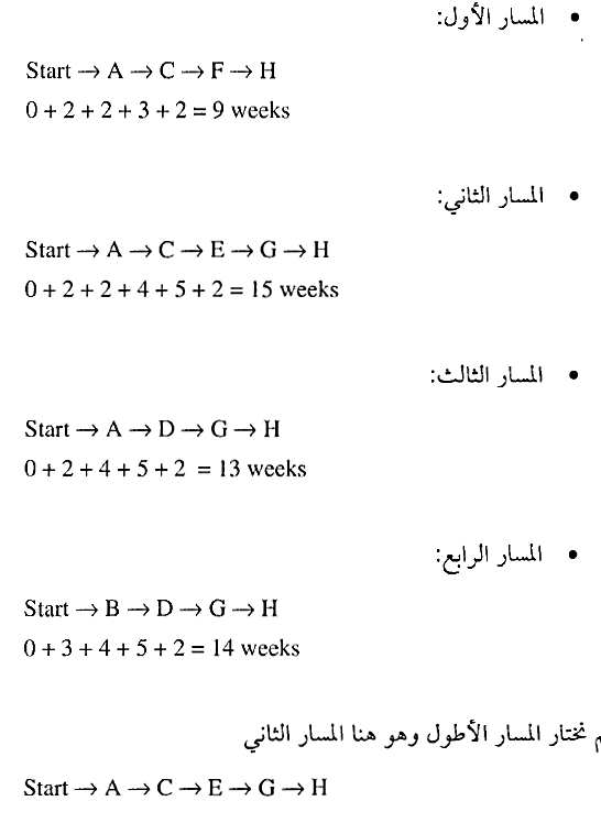 والبالغ 15 أسبوع. وللتأكد من أن المسار الحرج صحيح فإن جميع الأنشطة التي تقع عليه يجب أن تكون حرجة وليست راكدة ( أي ليس بها أي أوقات فائضة كما يظهر من خط المسار الحرج الموضح بالأسهم ) المزدوجة في شكل 6-8