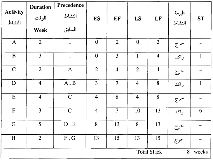 5. تحديد الأوقات الفائضة (ST): لتحديد الأوقات الفائضة يجب أولاً تحديد الأنشطة الراكدة، وهي الأنشطة التي إذا حصل بها تأخير فإنها لن تؤدي إلى تأخير المشروع ككل. وهذه الأوقات موضحة في الجدول 6-4 ومنها يتضح أن الأوقات الفائضة يساوي 8 أسابيع.
