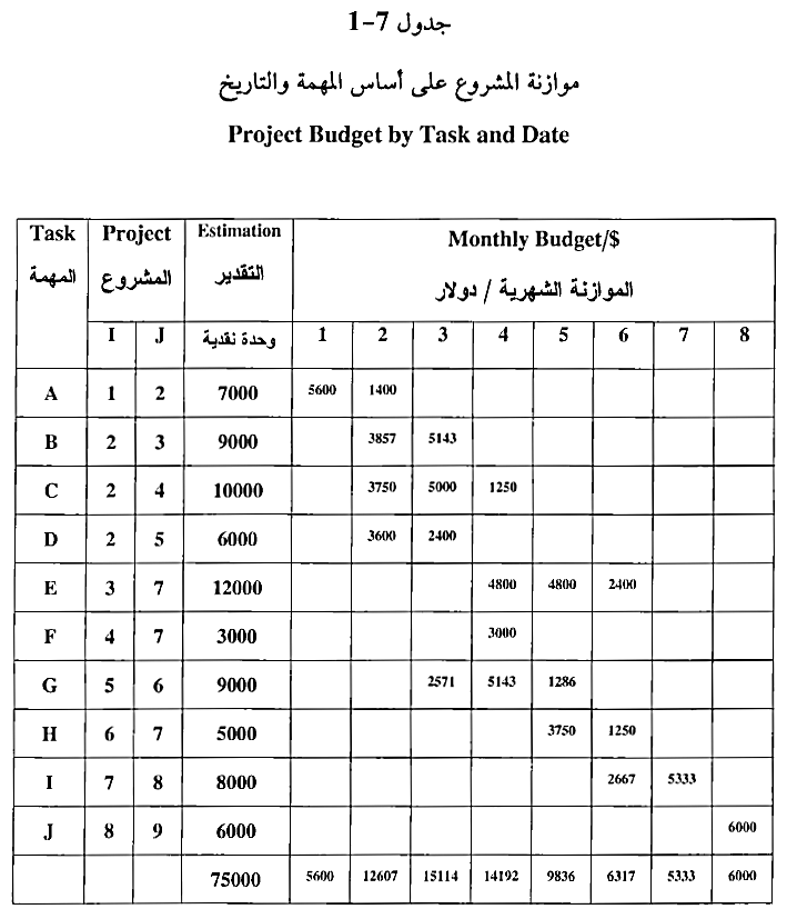 2. إن إعداد الموازنة يعتمد على نجزئه هيكل العمل (Work Break Structure (BS أي إلى تحليل المشروع الى مهمات والمهمة الى حزم عمل وحزمة العمل إلى وحدات عمل ووحدة العمل إلى أنشطة. وعند الوصول إلى الجزء الأولي وهو النشاط الذي سيؤديه فرد أو مجموعة فإنّه مطلوب منه أن يجيب على الأسئلة الواردة في البند 1 وذلك من أجل تحديد الوقت اللازم والموارد البشرية اللازمة والمواد المطلوبة لتنفيذ هذا النشاط، وكلفة هذه الموارد مجتمعة هي الموازنة التقديرية لهذا النشاط وعندما يتم إعادة تجميع الأنشطة ووحدات العمل وحزم العمل والمهمات من مرتبة إداريــة إلى مرتبة أعلى حتى تصل إلى مدير المشروع بشكل تجميعي Collective حيث تتم مراجعتها والتدقيق عليها وإعطاءها الشكل النهائي وهكذا فإن احتساب كلفة المشروع قد تم بطريقه متدرجة ومتدحرجة Rolled Up من المستوى الأدنى إلى المستوى الأعلى حتى نصل الى الموازنة التقديرية الإجمالية للمشروع، ومن إيجابيات هذه الطريقة أنها أكثر دقة من الطرق السابقة وذلك لأن الاشخاص المعنيين في مواقع العمل المباشرة هم أقدر على تحديد احتياجاتهم الفعلية من غيرهم، كما إن من إيجابياتها شمولها للمدراء في المراتب الدنيا في عملية إعداد الموازنة، وهذا يساعد على زيادة التزامهم وارتباطهم بتنفيذ هذه الموازنة لأنهم شاركوا في إعدادها، كما إن هذه الطريقة تعتبر أداة تدريبية لمختلف المستويات الإدارية في إعداد الموازنات وزيادة الخبرات العملية للمشاركين في إعداد الموازنة. ويوضح الشكل 7-1- نموذجاً لإعداد الموازنة التقديرية بهذه الطريقة.