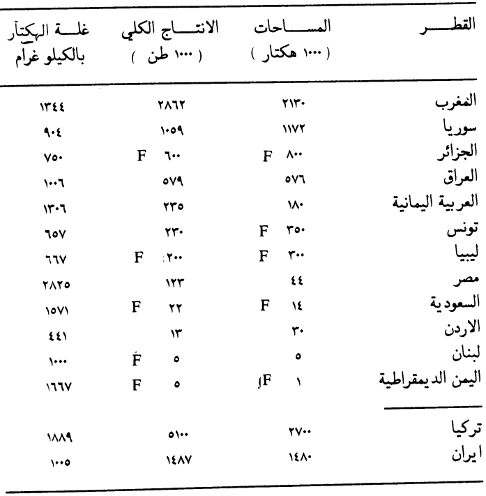 جدول ( 2 ) يبين المساحات والانتاج الكلي وغلة الهكتار للأقطار العربية والدول المجاورة للعراق حسب احصائية سنة 1976 (0.1976.F.A) .