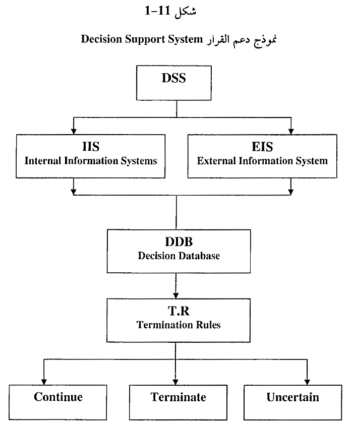 وقد طور (1989 ,Shafar and Mantel) نموذج للمساعدة في اتخاذ قرار بخصوص إنهاء المشروع اسمه نظام دعم القرار Decision Support System والذي يعتمد على نموذج العلاقات الموزونة للعوامل المقيدة لاتخاذ القرار ويتم من خلاله جمع البيانات عن المشروع نفسه وعن المنظمة الأم وعن البيئة التي يعمل بها المشروع، وهذه البيانات تستخدم في تحديد الأوزان والدرجات التي تمنح لكل عامل من العوامل وتكون هي مدخلات نموذج دعم القرار كما هو موضح في الشكل 11-1، وفيه يتم معالجة البيانات بالخطوات التالية: