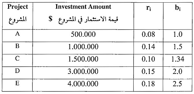 ترغب شركة مقاولات في الاستثمار مبلغ عشرة ملايين دولار في برنامج مشاريع مقاولات انشائية مكون من خمسة مشاريع . وتوفرت لديك البيانات الموجودة في جدول 9-17 عن نسب الاستثمار والعائد المتوقع والمخاطرة .