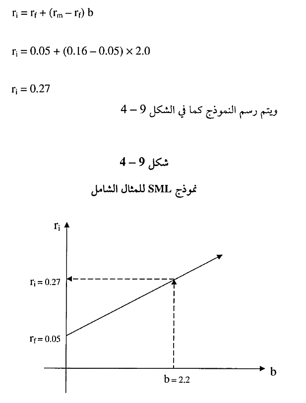 ويسمى أيضا (Security Market Line Model (SML وهو نموذج يمثل علاقة خطية Linear Relationship بين العائد المطلوب Required Rate of Return ويرمز له ، ومعامل المخاطرة Risk Factor بيتا ويرمز له b . وحتى نتمكن من استخدام هذا النموذج بطريقة ناجحة لا بد من معرفة معدل العائد على السوق Fm بالإضافة إلى معدل العائد الحالي من المخاطرة Risk Free Rate of Return ويرمز له ، ويحسب على أساس العائد على السندات الحكومية وذلك لأنّ سدادها مضمون وخالي من المخاطر لأنها مكفولة من الحكومة ويتم التعبير عن العلاقة الخطية بين العائد المطلوب والمخاطرة b في النموذج SML بالمعادلة التالية: