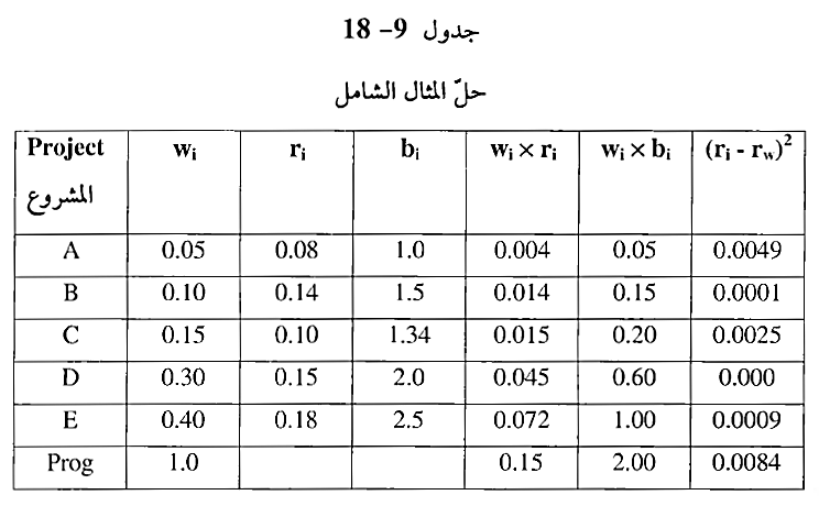 • حساب الوزن النسبي Wi لكل مشروع، وذلك بقسمة قيمة الاستثمار في كل مشروع على الاستثمار الكلي في البرنامج والنتائج موجودة في جدول 9-18.