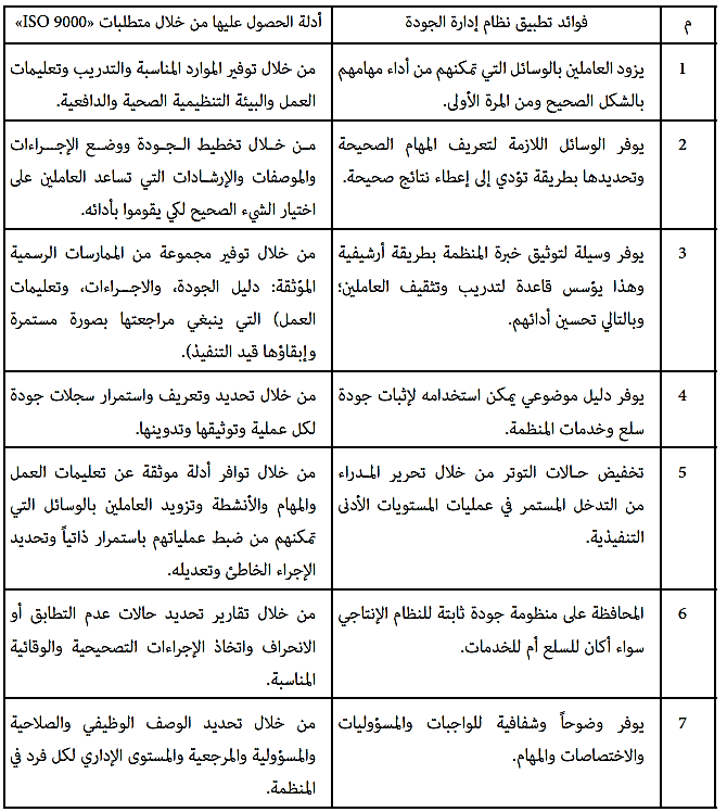 ويمكن توضيح فوائد تطبيق نظام إدارة الجودة وأدلة الحصول عليها من خلال مواصفات «ISO9000 من خلال الجدول (1) التالي :