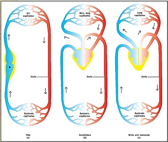 Vertebrate circulatory systems. Oxygen-rich blood is shown as red and oxygen-poor blood as blue. (a) In fish, the heart has one atrium (A) and one ventricle (V). Blood oxygenated in the gill capillaries flows directly to the capillaries of the systemic circulation without first returning to the heart. (b) In amphibians, the single atrium is divided into two separate chambers. Oxygen-rich blood from the lungs enters one atrium, and oxygen-poor blood enters the other. Oxygen-rich blood is pumped from one ventricle to the body tissues, while oxygen-poor blood is sent from the lungs to the skin, which is a major respiratory organ in amphibians. (c) In birds and mammals, the atrium and ventricle are divided into two separate chambers, forming two hearts. One pumps oxygen-rich blood through the body, and one pumps oxygen-poor blood through the lungs.