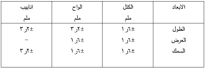 لا يختلف معدل الطول والعرض والسمك والمقاس عن الابعاد القياسية باكثر من التفاوتات المبينة في الجدول رقم (9-6) .
