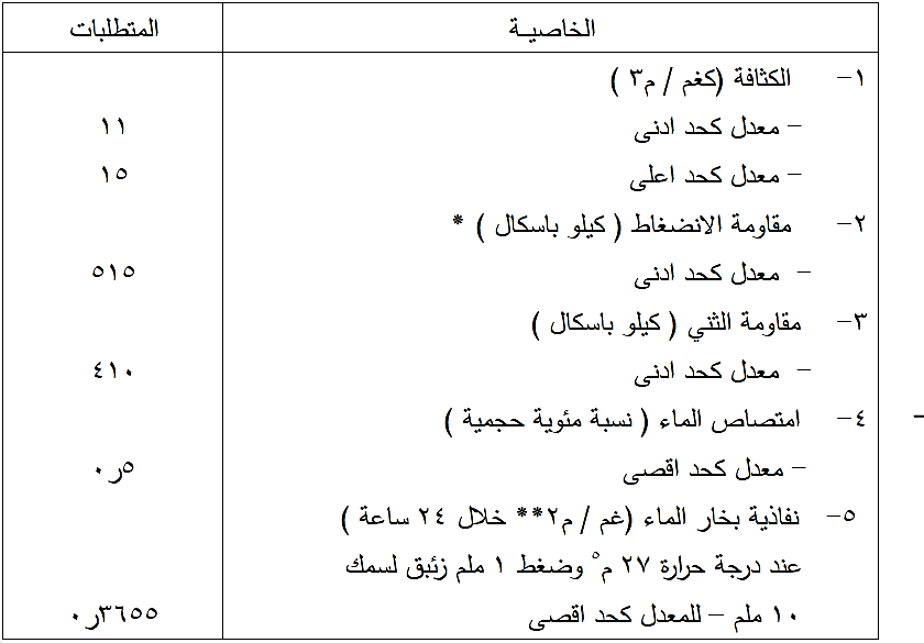 تطابق خواص الزجاج الخلوي المتطلبات الواردة في المواصفة القياسية العراقية رقم (1475) وكما مبين في الجدولين رقم (9-7) و (9- 8) على التوالي :