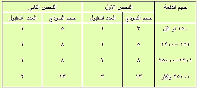 تقبل الدفعة اذا كان عدد الوحدات غير المطابقة مساويا الى او اقل من العدد المقبول المثبت في الجدول رقم (9-4) .