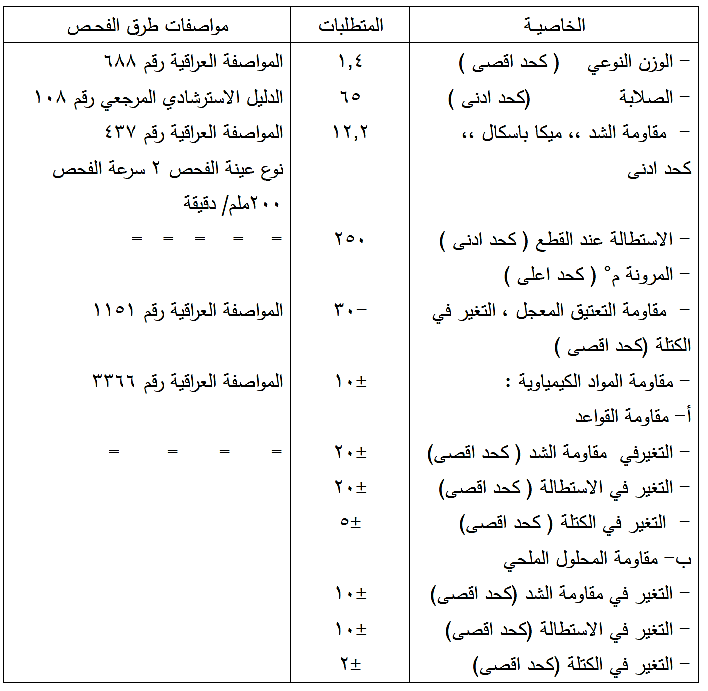 يتم اجراء الفحوص لأغراض المطابقة وفق المواصفة القياسية العراقية ( رقم 1280)
